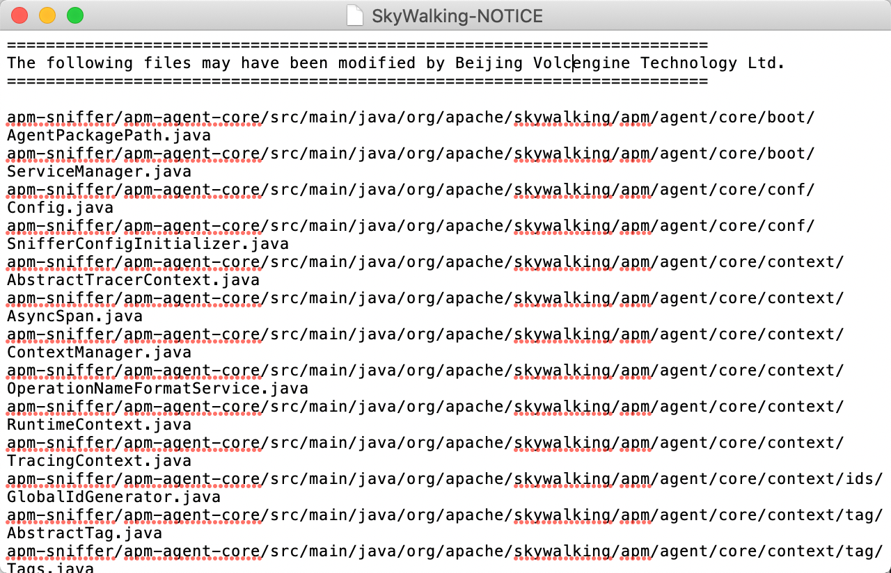 Volcengine Inc.’s team changed all package names, removed the Apache Software Foundation’s header, and don’t keep Apache Software Foundation and Apache SkyWalking’s LICENSE and NOTICE file in their redistribution.